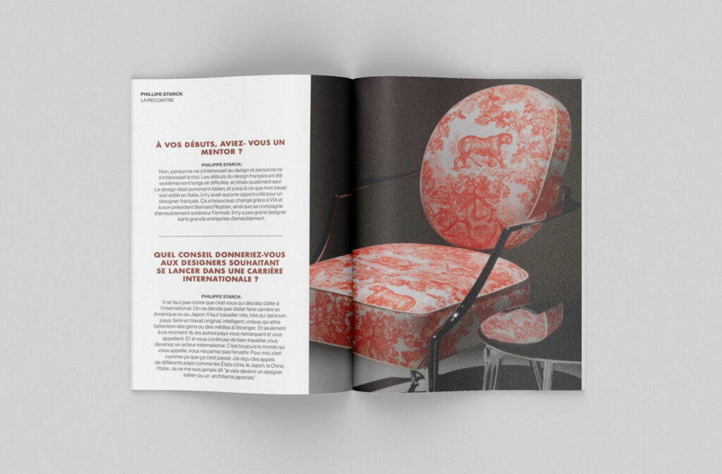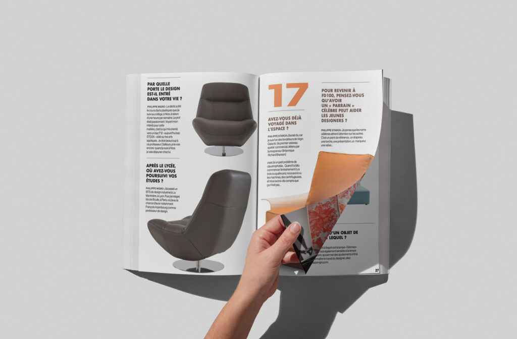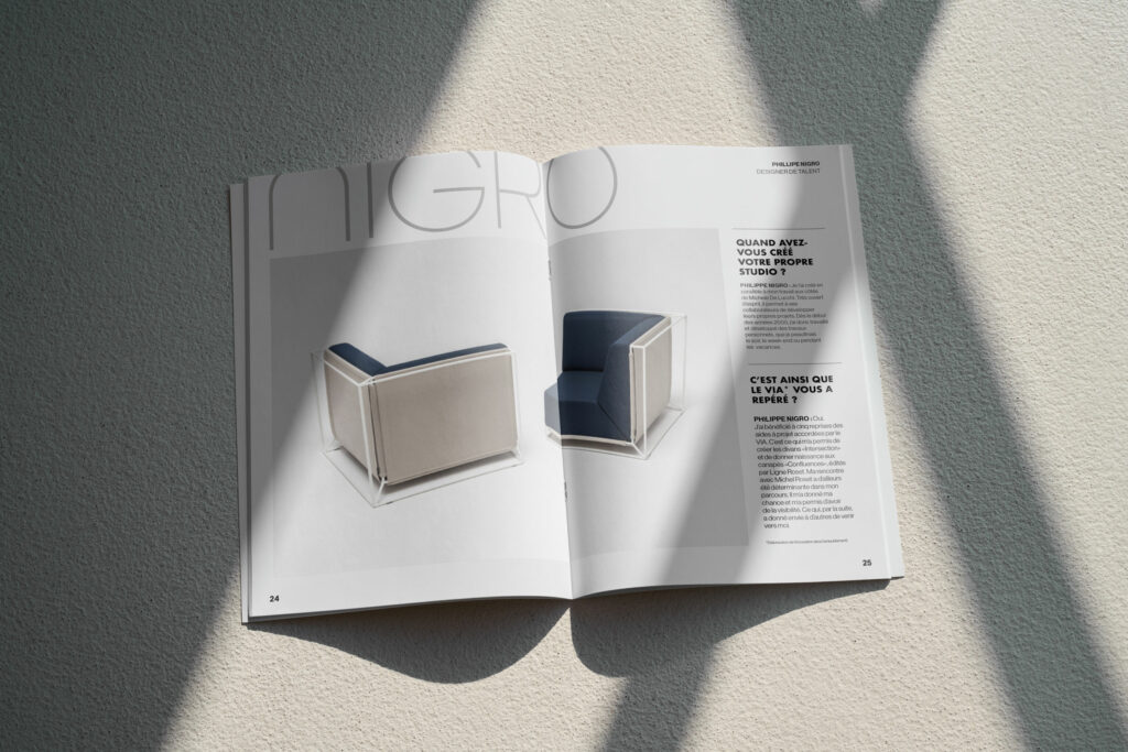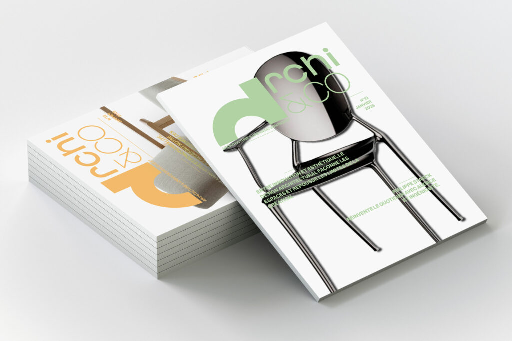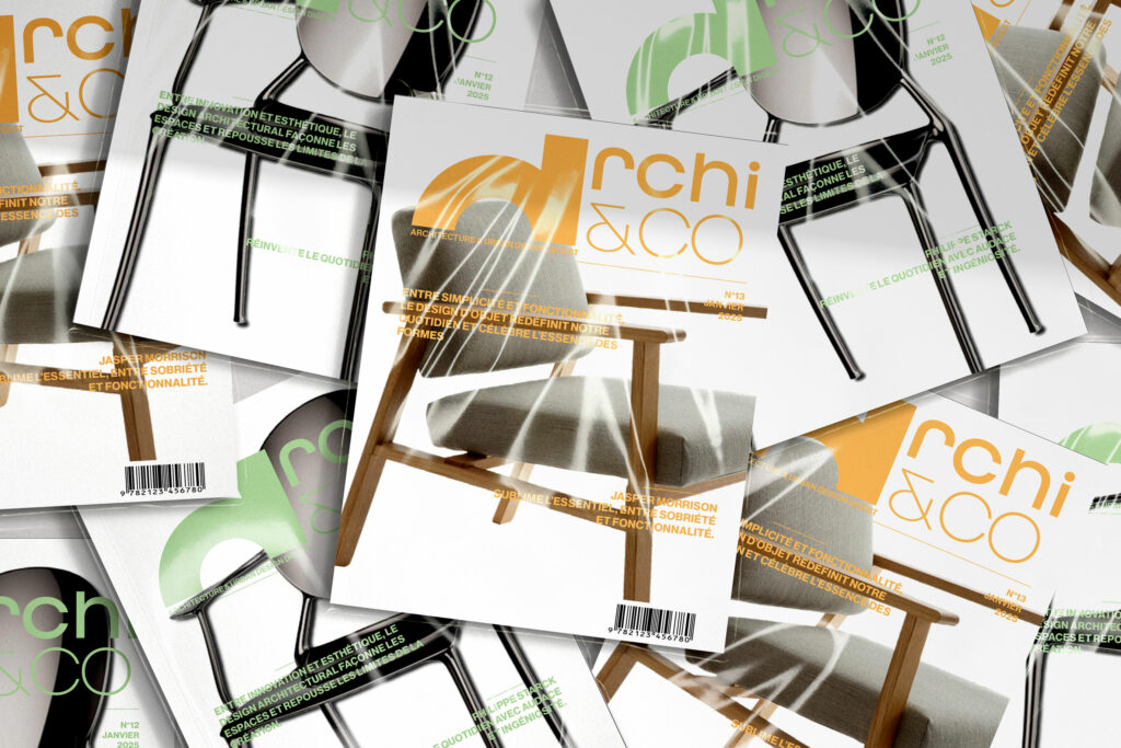 Chaque page d’Archi & Co est conçue comme une composition architecturale : la grille guide le placement des textes, du logo et des images, tout en laissant la place à la créativité. Les photos pleine pages, parfois interrompues ou « coupées » par la mise en page, créent un rythme visuel et dynamisent la lecture. Les titres deviennent des éléments structurant, qui interagissent avec l’espace pour transformer chaque page en composition équilibrée, où la forme et le contenu se répondent pour raconter le projet avec précision et modernité.