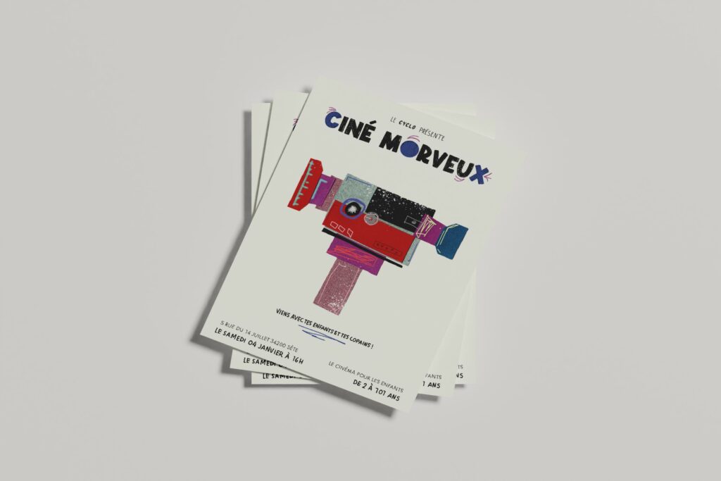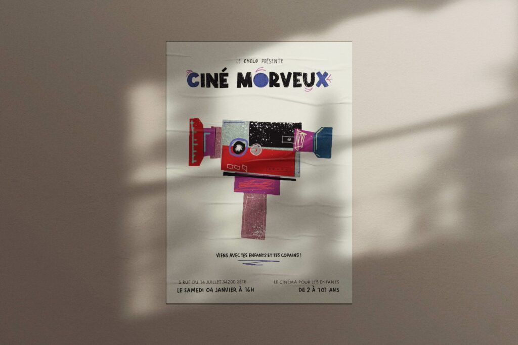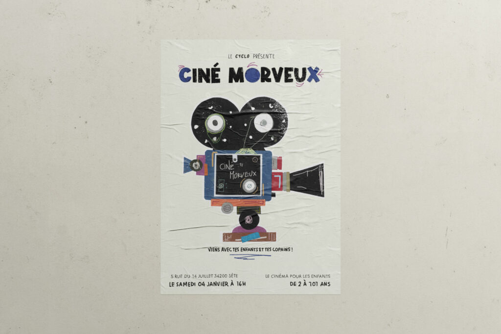Ciné Morveux est un projet d’affiche conçu pour promouvoir un événement convivial autour du cinéma, organisé par Le Cyclo. Pensé comme un temps de rencontre et de création, l’événement s’inspire d’une concept de do it yourself, invitant les enfants à devenir les réalisateurs de leur propre film. À travers cette approche, le projet valorise la liberté d’expression, l’expérimentation et le regard singulier que chacun porte sur le monde. Les enfants sont encouragés à inventer leurs histoires, à manipuler les images et à s’approprier les codes du cinéma de manière ludique et accessible.