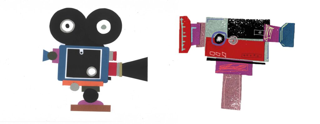 Pour la création des éléments graphiques, j’ai commencé par découper différentes formes en papier. Ensuite, je les ai assemblées de manière inventive pour créer les caméras, en jouant avec des formes et des proportions. Enfin, j’ai dessiné par-dessus pour ajouter des détails et enrichir visuellement chaque élément, combinant ainsi créativité manuelle et finesse graphique tout en restant fidèle à l’esprit DIY de l’évènement.