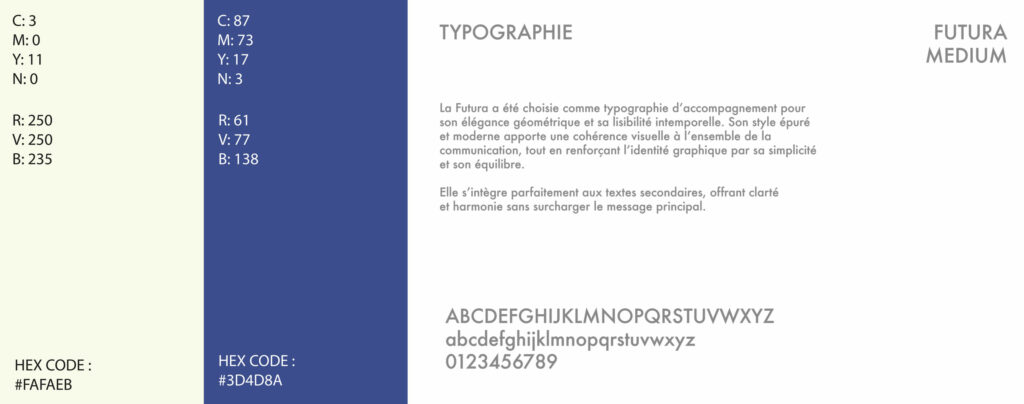 La typographie choisie est la Futura, que j’ai volontairement personnalisée à la mains pour lui donner un caractère vivant et unique. Les couleurs beige et violet créent un contraste donc et ludique, en harmonie avec l’esprit créatif de l’évènement.