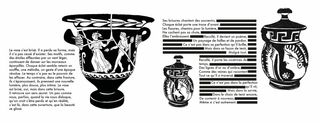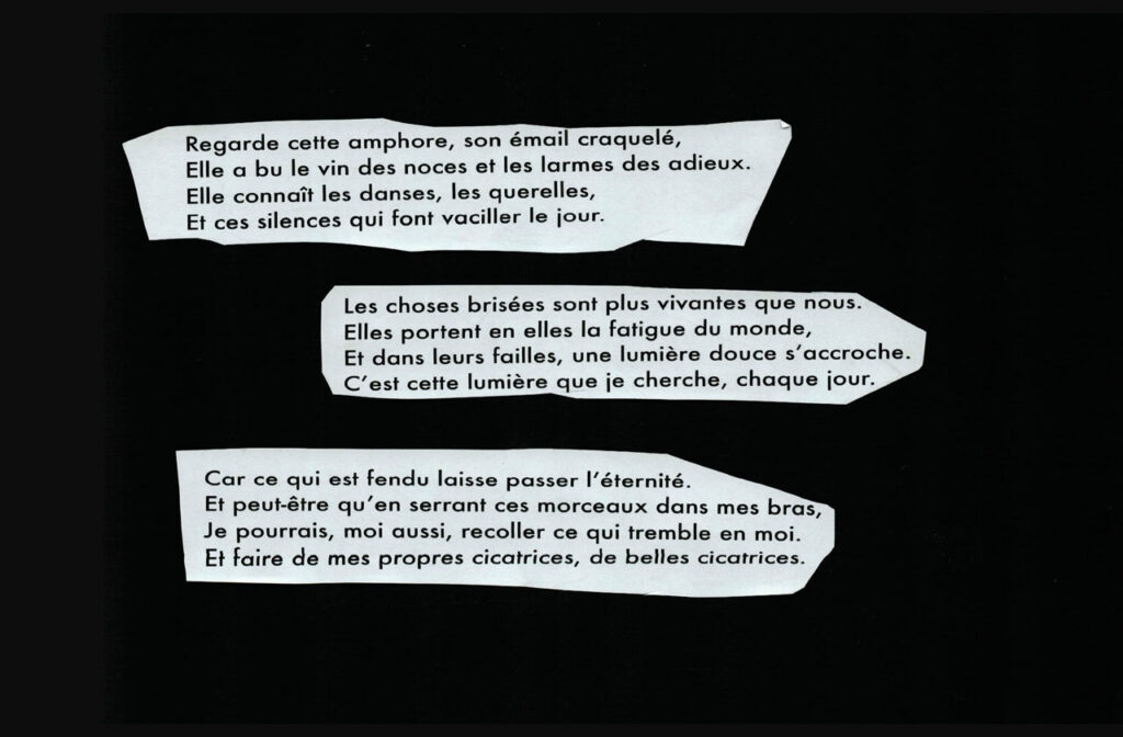 « Les cicatrices des objets » est une micro-édition qui explore la mémoire silencieuse des artefacts du musée de l’Éphèbe à Agde. À travers l’observation de leurs éraflures, fissures et patines, ce projet met en lumière les traces laissées par le temps : non pas des imperfections à cacher, mais des marques à contempler.