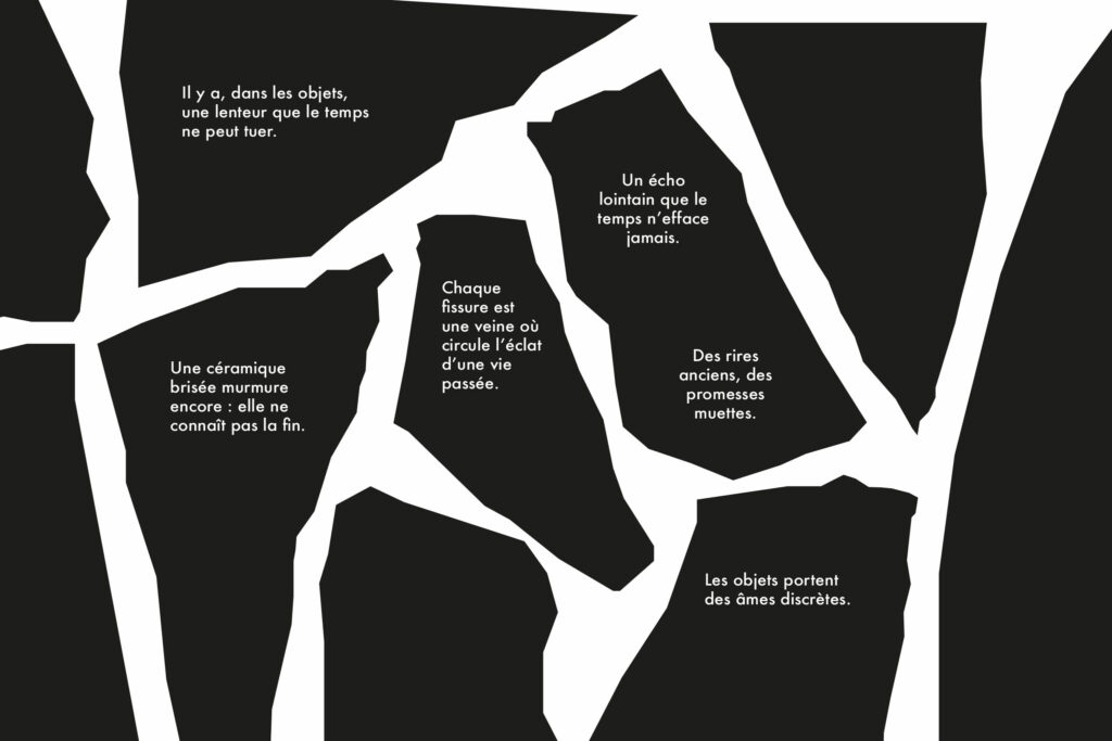 Les objets sont représentés neuf puis brisé. Ce contraste permet de montrer le passage du temps et la transformation de l’objet. L’usure et la casse ne sont pas traitées comme des défauts, mais comme des éléments porteurs de mémoire et de récit. La dégradation devient un langage visuel.