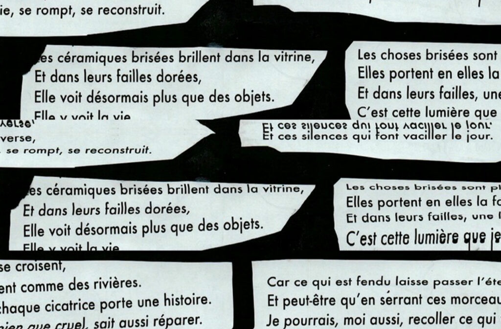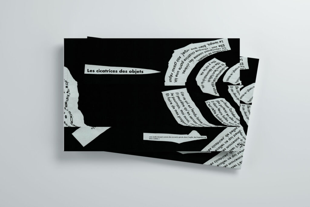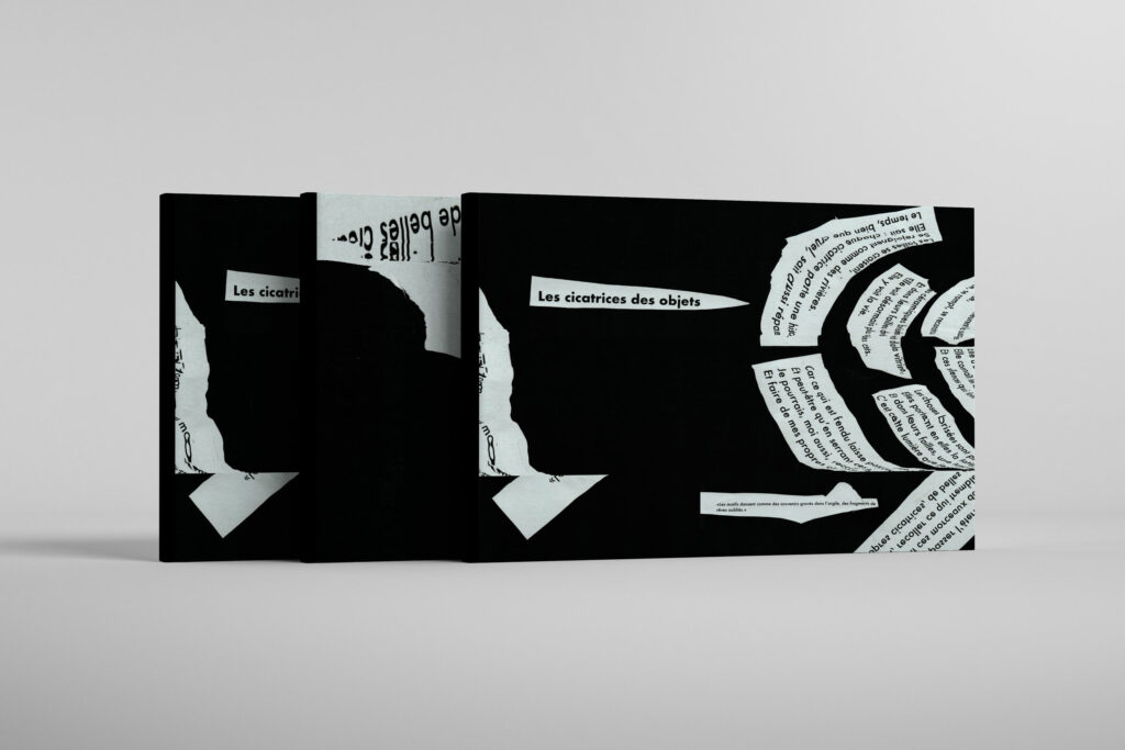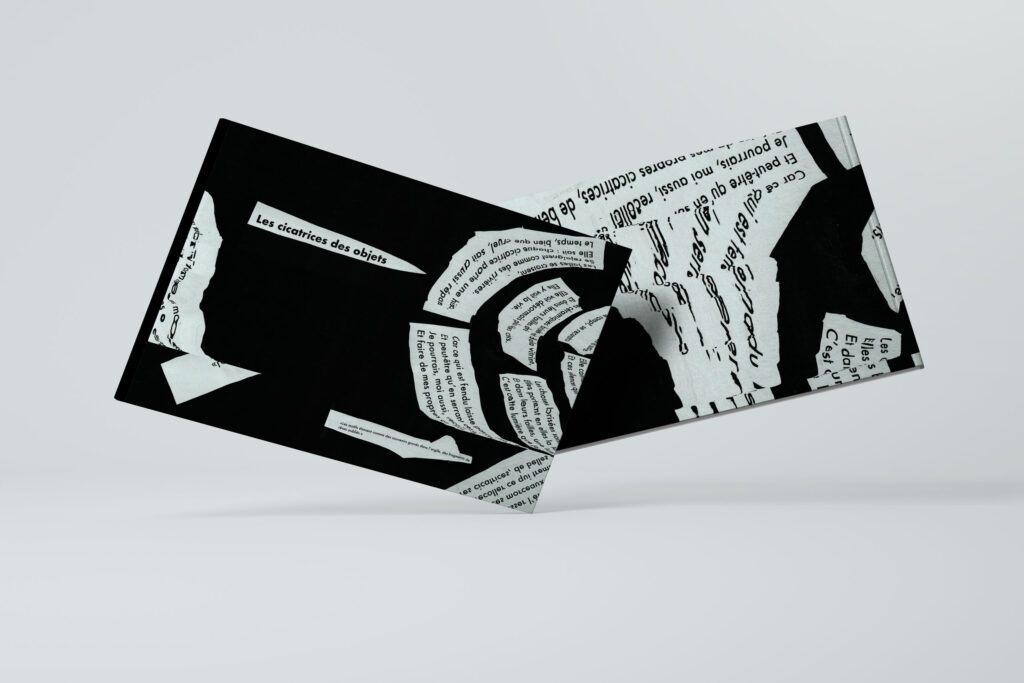 L’intention de cette micro-édition repose sur la volonté de donner une voix aux objets. À travers une exploration visuelle et sensorielle, j’ai cherché à rendre perceptible ce qu’ils portent en silence : le temps, l’usage, la mémoire.  La couverture a été conçue comme un objet à part entière, réalisée au scanner. Ce collage fait écho à l’usure des objets : les mots, comme la matière, se brisent, se placent et deviennent porteurs de sens. La couverture agit ainsi comme une première lecture sensible du projet.